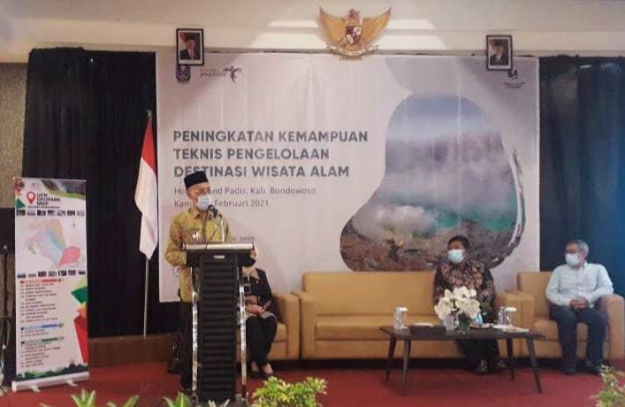 BONDOWOSO – Ungkit Proyeksi Perkembangan Pariwisata di Tapal Kuda.Dinas Kebudayaan dan Pariwisata Provinsi Jawa Timur mengelar acara Peningkatan Kemampuan Teknis Pengelolaan Destinasi Alam yang diikuti 5 kabupaten di Hotel Grand Padis, Kamis (11/2/2021).