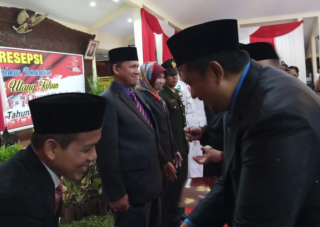 Bondowoso – Wakil Bupati Bondowoso H.Irwan Bachtiar Rahmat didampingi Sekretaris Daerah (Sekda) H.Syaifullah menyerahkan tanda kehormatan satyalancana karya satya tahun 2019 pada acara Resepsi HUT RI ke 74 di Pendopo Bupati Bondowoso,Sabtu 17/08/2019 malam.