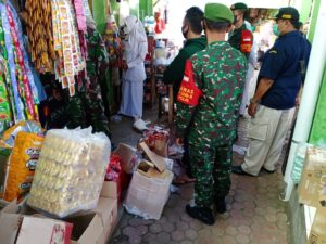 Bondowoso , Anggota Koramil Kota Bondowoso Serka Mulyadi, Serda Faisal Fajar, Koptu M. Ridwan, Serda Epi Yunia K melakukan pendisiplinan protokol kesehatan (Prokes) Covid-19 di Pasar Nangkaan Bondowoso.