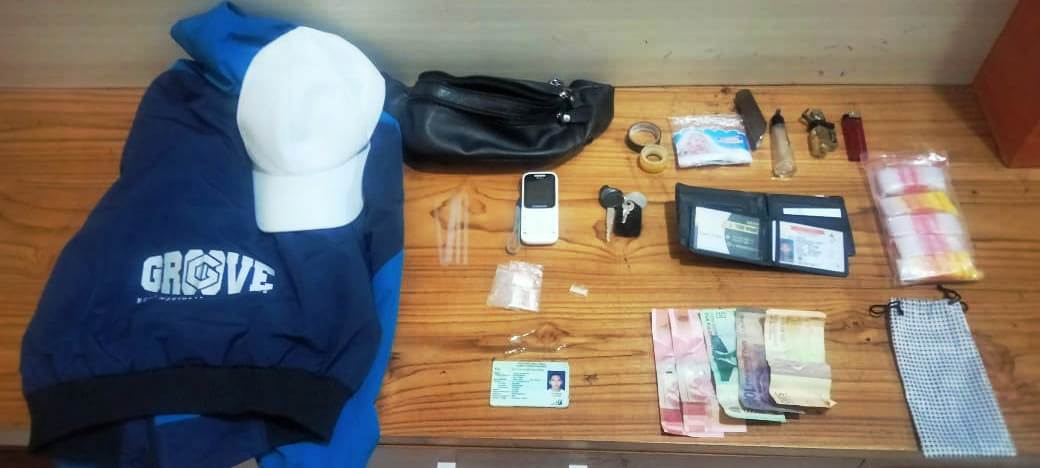 Barang bukti yang diamankan petugas diantaranya 4 paket sabu dalam bungkus plastik masing-masing 0,23 gram, 0,30 gram, 0,30 gram dan 0,28 gram, kemudian 2 buah pipet kaca, 1 buah alat hisap atau bong, 1 pak plastik klip, 2 buah isolasi warga hitam dan bening, 5 buah sedotan plastik, 1 buah kantong kain, 1 buah korek, 1 buah HP, 1 buah jaket dan tas warna hitam.