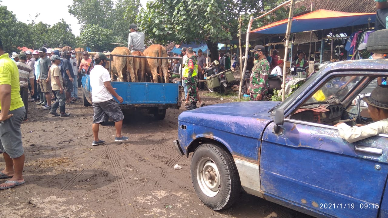 Bondowoso, Serda Ruslan dan Serda Slamet Sulaiman Babinsa Kelurahan Kademangan melakukan oprasi yustisi penanganan Covid-19 di Pasar Hewan Bondowoso, Selasa 19/01/2021.