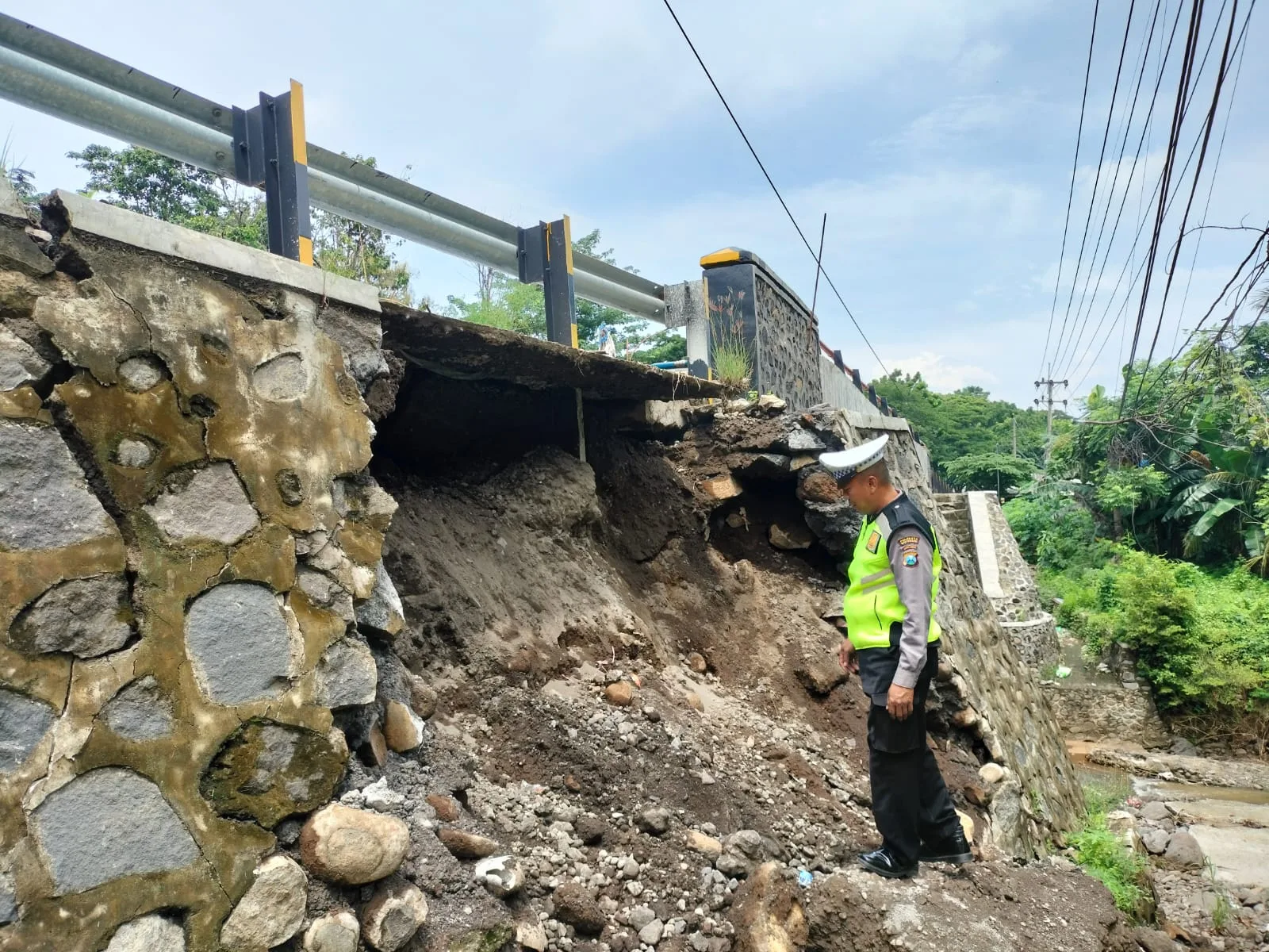 “Dari hasil pengecekan, bagian yang ambrol itu adalah dinding penahan jembatan,” kata Eko kepada wartawan.