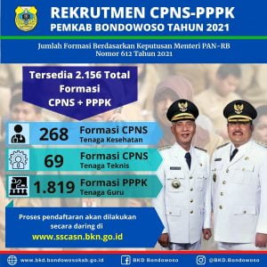 Adapun rekrutmen CPNS-PPPK Kabupaten Bondowoso menyediakan total formasi sebanyak 2.156 dengan rincian 268 untuk formasi CPNS tenaga kesehatan, 69 CPNS Tenaga teknis dan 1.819 PPPK tenaga guru.