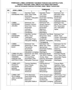 Lebih lanjut, dia mengatakan, pemberian award  dilaksanakan hari ini (19/10) dalam acara peringatan Hari Pangan Sedunia (HPS). Penyerahan penghargaan akan dilakukan langsung oleh Gubernur Jatim Khofifah Indar Parawansa di JX International Convention Exhibition Surabaya yang dihadiri oleh buapti / walkot , Kadisperta serta pemenang lomba se Jawa Timur.