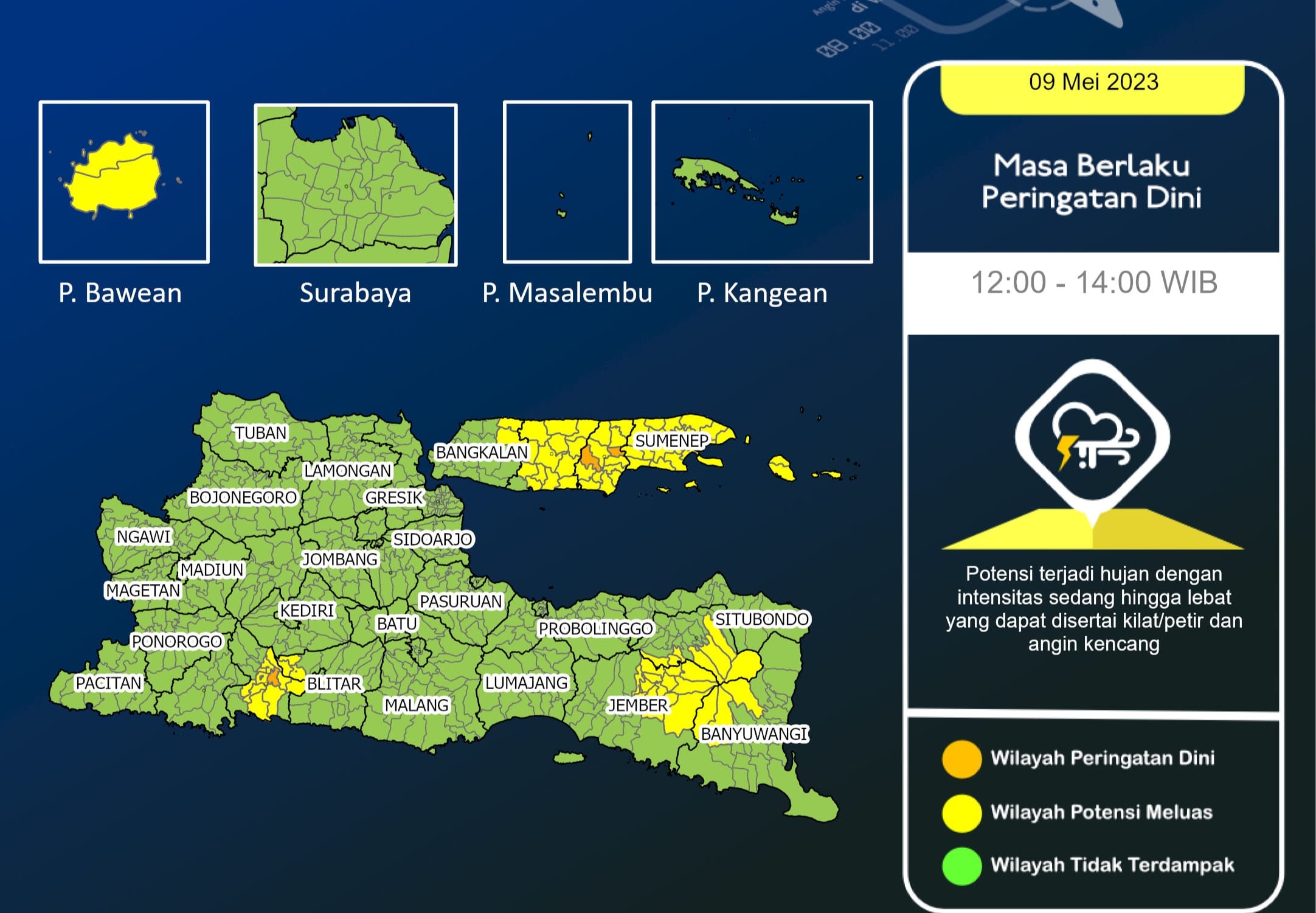 āKami perkirakan hujan ringan hingga sedang akan mengguyur daerah Banyuwangi pada malam hingga dini hari. Bondowoso pada pagi, siang, dan malam hari. Probolinggo pada dini hari, Situbondo dan Lumajang pada siang, malam hingga dini hari,ā jelasnya ,Rabu (10/05/2023).