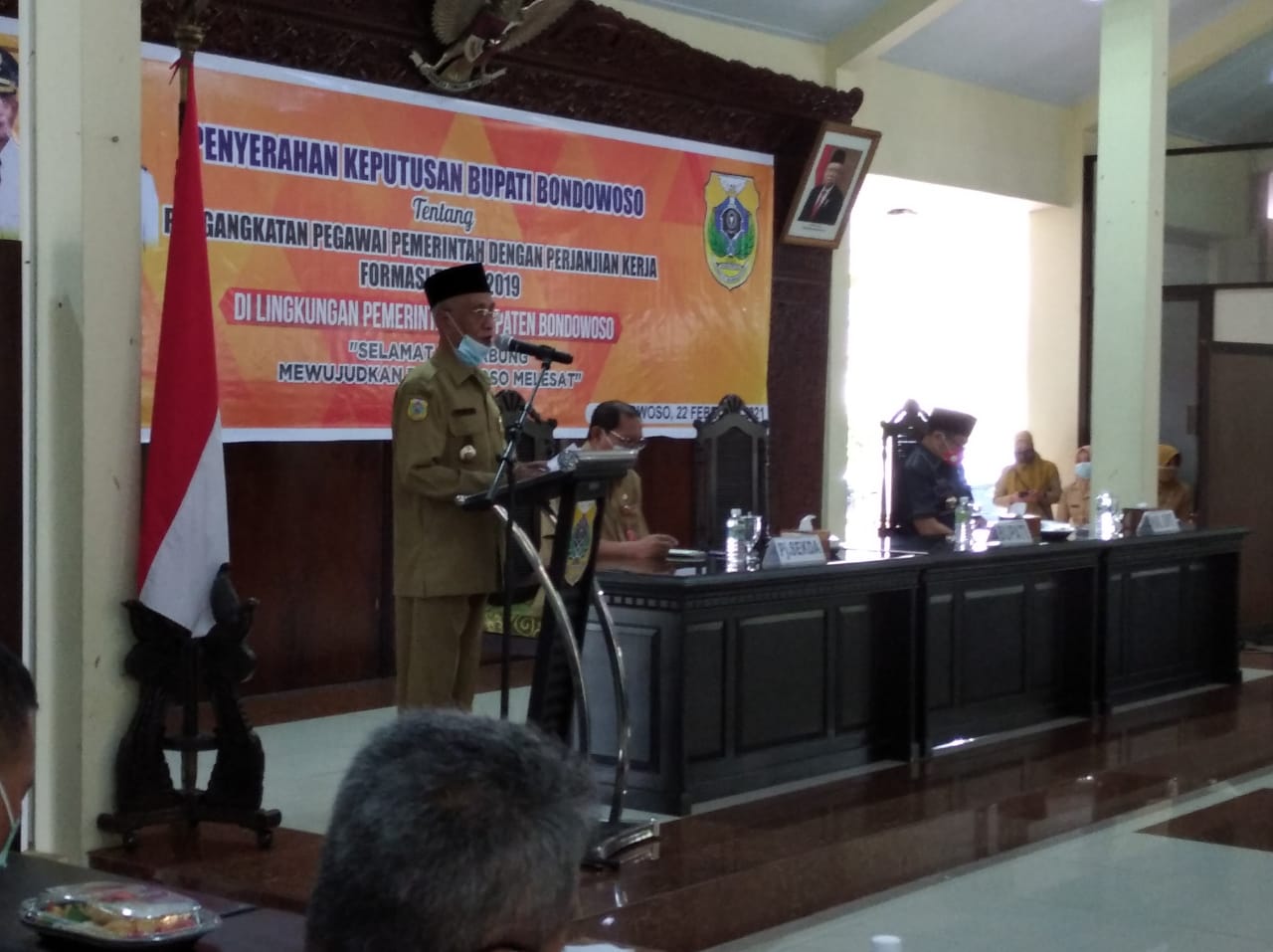 Bondowoso , Bupati Bondowoso ,KH.Salwa Arifin menyerahka 213 Surat Keputusan (SK) Pegawai Pemerintah dengan Perjanjian Kerja (PPPK) Guru dan PPLĀ di Pendopo Bupati Bondowoso,Jawa Timur , Senin 22,02/2021.