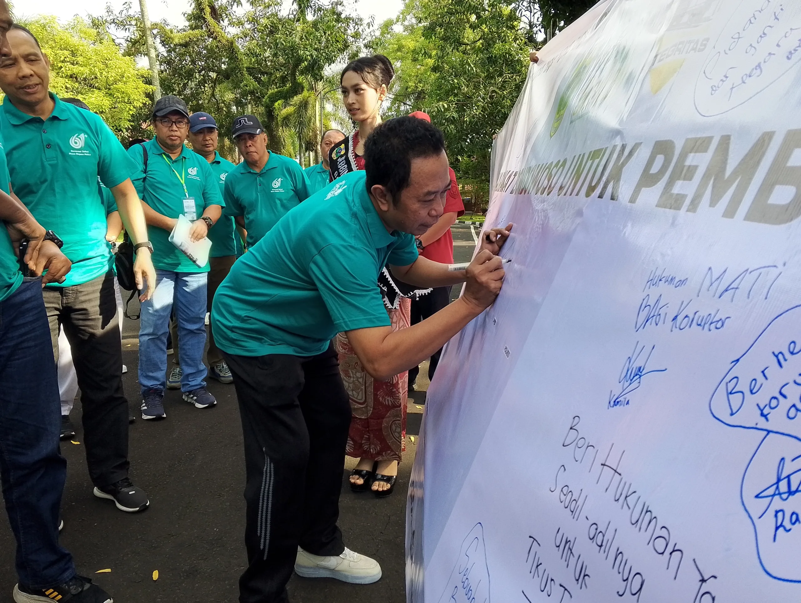 Dalam spanduk tersebut, masyarakat menuliskan berbagai pesan tegas. Beberapa di antaranya berbunyi, “Beri hukuman untuk tikus-tikus berdasi,” serta “Kapan negara maju jika tetap korupsi, korup hilang keadilan datang.” Aspirasi tersebut menggambarkan kuatnya harapan warga agar penanganan kasus korupsi dilakukan secara serius dan transparan.