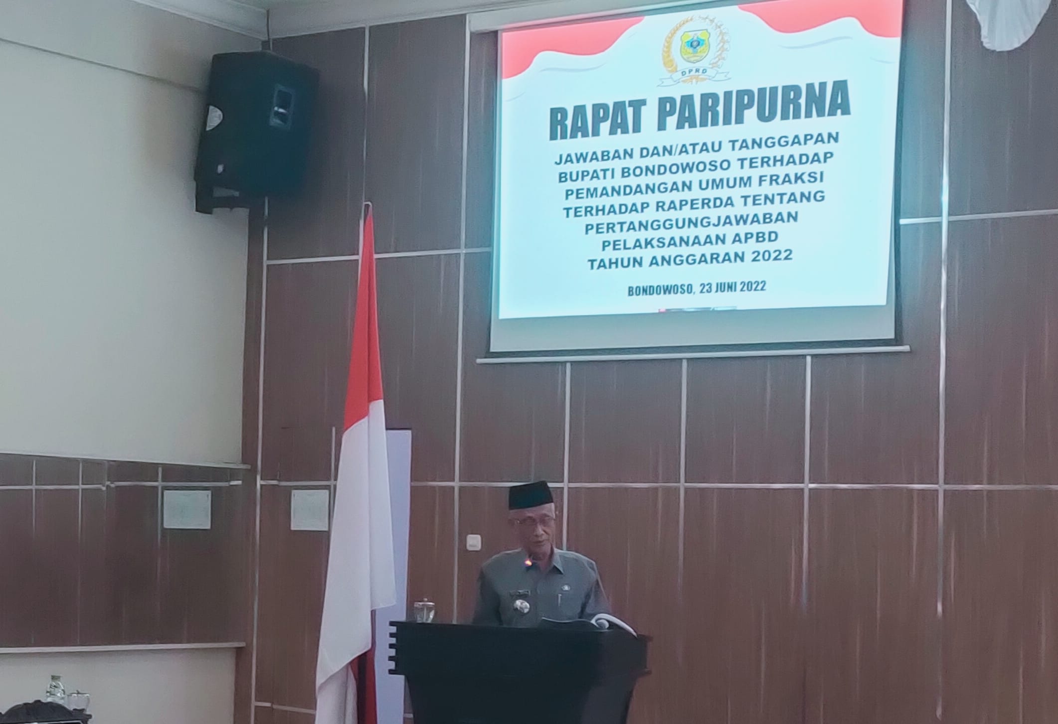 Bondowoso -Bupati Bondowoso KH.Salwa Arifin menyampaikan jawaban terhadap pandangan umum Fraksi dalam rapat paripurna di Graha Paripurna DPRD Bondowoso, Jum’at 23 /06/2023.