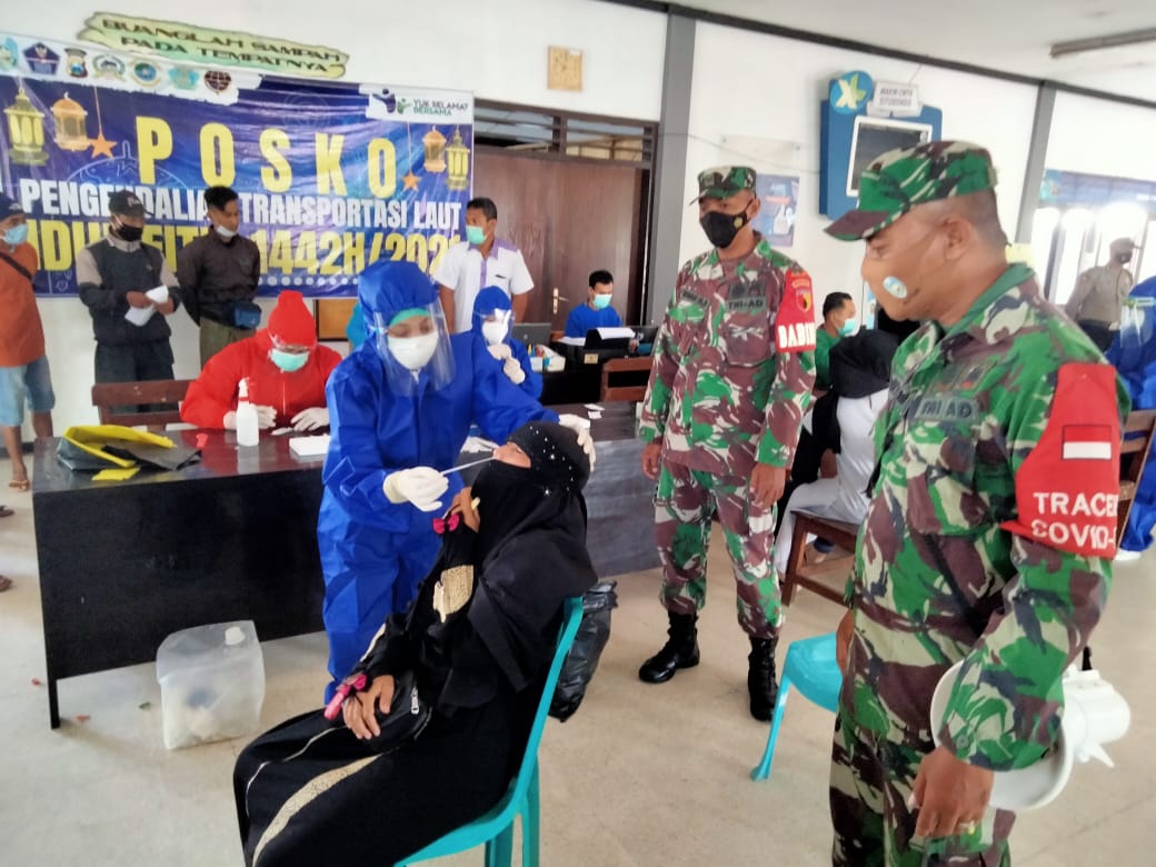 SITUBONDO – Pada hari Jum’at pada tanggal 18 Juni 2021, Danramil 09 Jangkar Kapten Inf Sunaryo bersama tiga anggotanya memantau kegiatan sweb yang bertempat di pelabuhan Jangkar. Pelaksanaan kegiatan itu yakni dalam rangka Pengambilan Sampel Sweb Antigen Kepada Seluruh Calon Penumpang KMP MUNGGIANGGO HULALO yang akan berangkat dari pelabuhan Jangkar dengan tujuan pulau Madura.