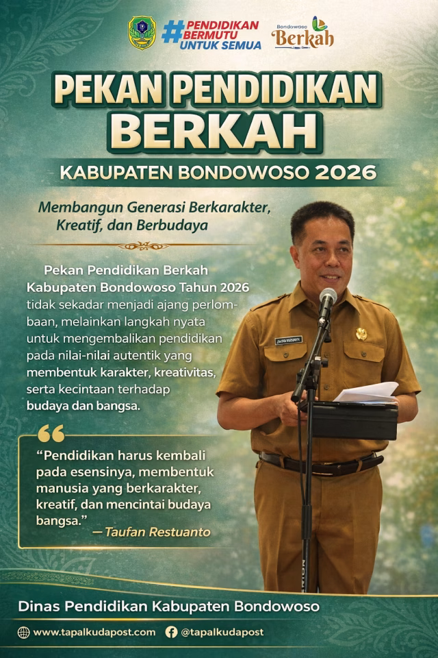 Melalui Pekan Pendidikan Berkah 2026, Kabupaten Bondowoso tidak hanya menghadirkan kompetisi, tetapi juga menumbuhkan harapan bahwa pendidikan mampu melahirkan generasi yang tangguh, unggul, berdaya saing global, serta berakar kuat pada budaya dan nilai keimanan.