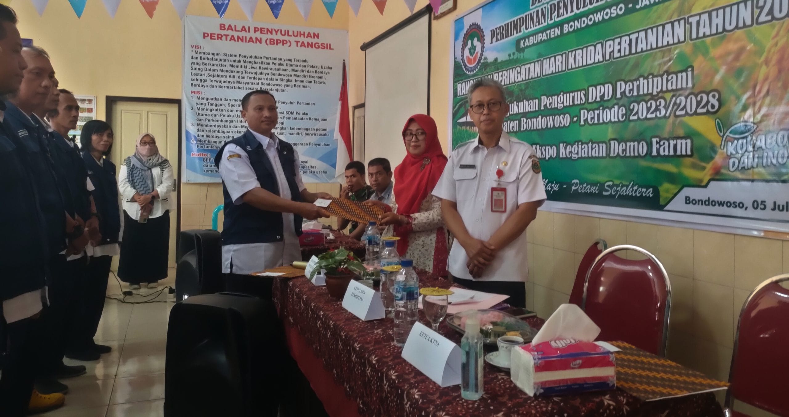 Bondowoso -Kepala.Dinas Pertanian dan Ketahanan Pangan (DPKP) Bondowoso Hendri Widotono menandatangani surat Pengukuhan Anggota Dewan Pengurus Daerah Perhimpunan Penyuluh Pertanian Indonesia (DPD PERHIPTANI) Bondowoso Masa Bakti 2023-2028. Acara ini dilaksanakan di Kantor Balai Penyuluh Pertanian (BPP) Tangsil Bondowoso,Rabu 5/07/2023.