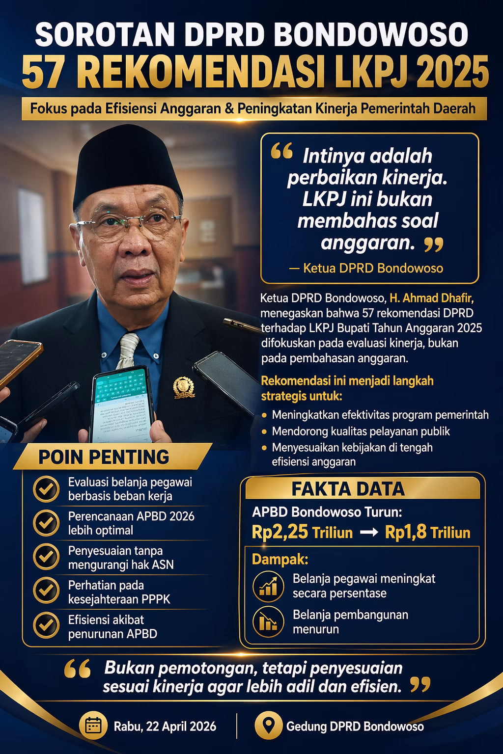 Bondowoso— Ketua DPRD Bondowoso, H. Ahmad Dhafir, menegaskan bahwa dari 57 rekomendasi yang disampaikan DPRD kepada Bupati terkait Laporan Keterangan Pertanggungjawaban (LKPJ) Tahun Anggaran 2025, fokus utama bukan pada aspek anggaran, melainkan perbaikan kinerja pemerintah daerah.