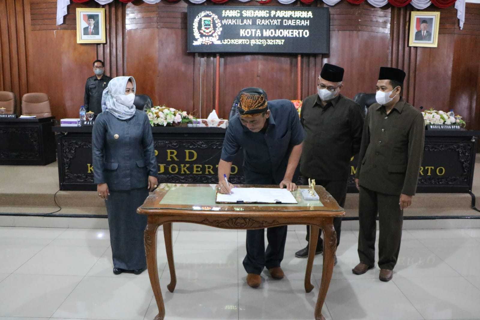 Hal ini ditandai dengan penandatanganan Berita Acara oleh Wali Kota Mojokerto Ika Puspitasari bersama Ketua DPRD Kota Mojokerto Sunarto, Wakil Ketua Sonny Basoeki Rahardjo dan Junaedi Malik dalam Rapat Paripurna yang digelar pada Senin (30/5/2022) di ruang Rapat DPRD Kota Mojokerto, Jl. Gajah Mada 145 Kota Mojokerto.