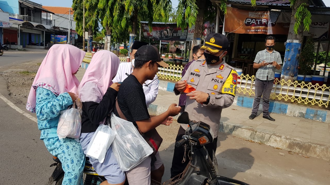 Situbondo – Kapolres Situbondo AKBP Ach. Imam Rifai, SH, SIK, M.PICT, M.ISS. bersama Forkopimda mebgaikan takjil dan masker kepada masyarakat sekaligus sosialisasi tidak mudik lebaran bertempat diseputar alun-alun kecamatan Besuki Situbondo, Rabu (28/4/2021).