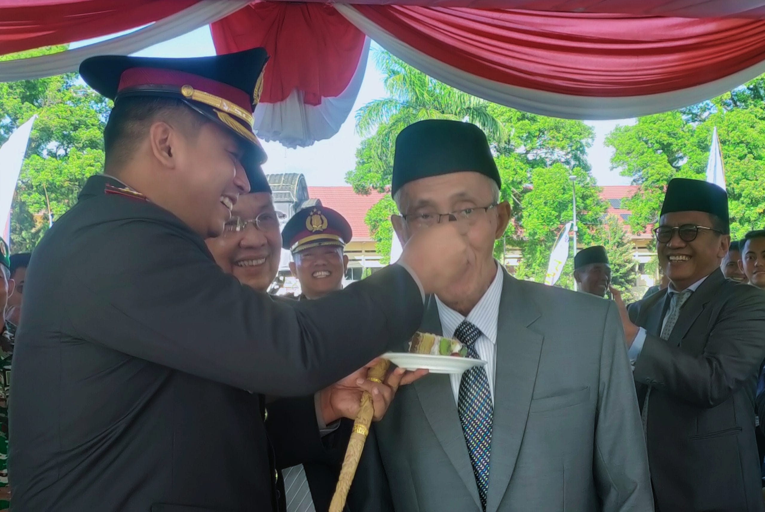 Bondowoso- Hal menarik perhatian saat usai upacara peringatan Hari Ulang Tahun (HUT) Bhayangkara Kapolres Bondowoso AKBP Bimo Ariyanto SH SIK menyuapi Bupati KH.Salwa Arifin Kue Tar atas surprais WS Dandim 0822 Bondowoso Mayor Inf Teguh Heri Wignyono ,S.I.P.