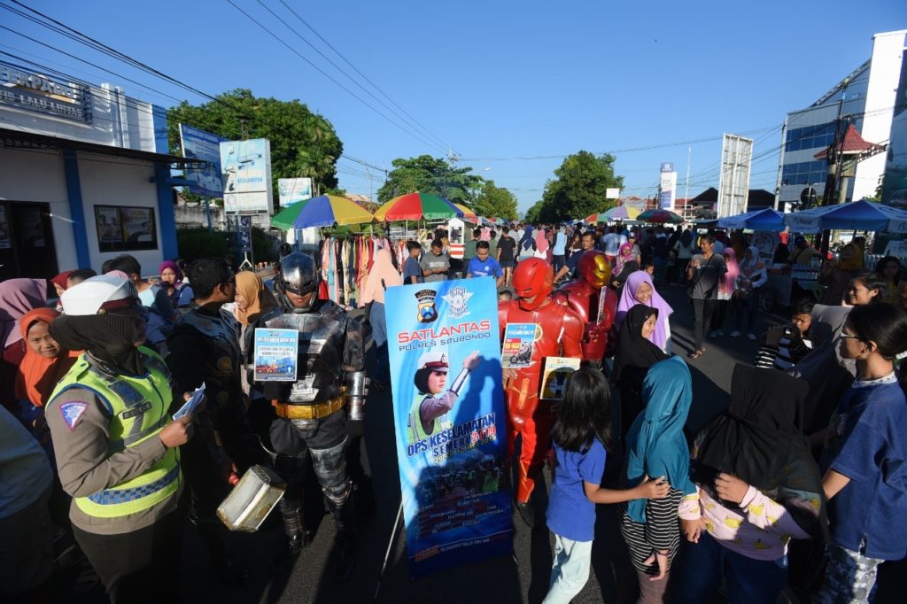 Kegiatan dipimpin oleh Kasat Lantas AKP Hendrix K Wardhana, S.H., S.I.K., M.H. bersama bebrapa anggota Polisi berseragam dan juga menggunakan kostum superhero guna menarik masyarakat pengunjung CFD di alun-alun Kabupaten Situbondo.