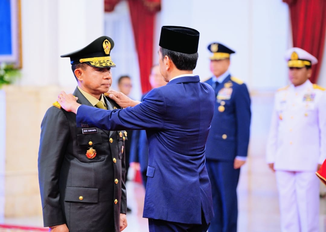 Jakarta – Presiden Joko Widodo melantik dan mengambil sumpah jabatan Jenderal TNI Agus Subiyanto sebagai Panglima Tentara Nasional Indonesia (TNI) di Istana Negara, Jakarta, pada Rabu, 22 November 2023.