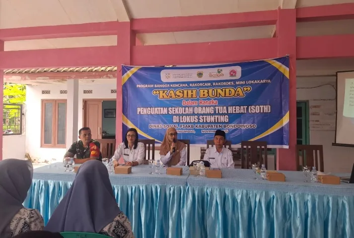Bondowoso — Dinas Sosial Pemberdayaan Perempuan dan Perlindungan Anak serta Keluarga Berencana (Dinsos P3AKB) Bondowoso menggelar kegiatan penguatan program Bangga Kencana melalui Rakorcam, Rakordes, dan Mini Lokakarya “Kasih Bunda” yang difokuskan pada penguatan Sekolah Orang Tua Hebat (SOTH) di lokus stunting,di Tangsil Kecamatan Wonosari , Rabu (26/11/2025).