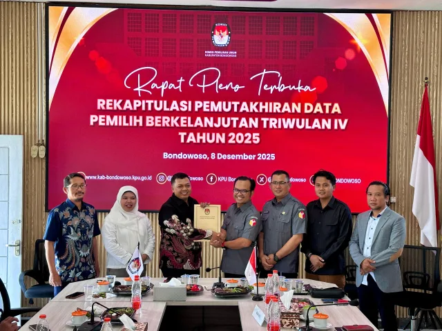Bondowoso — Komisi Pemilihan Umum (KPU) Kabupaten Bondowoso menggelar Rapat Pleno Terbuka Pemutakhiran Data Pemilih Berkelanjutan Triwulan IV di Aula KPU setempat, Senin (08/12/2025). Kegiatan tersebut dihadiri oleh Bawaslu Bondowoso, Kodim 0822, Polres Bondowoso, Disdukcapil, Bakesbangpol, Pertuni, serta perwakilan media.