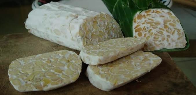 Tempe, makanan tradisional khas Indonesia, merupakan olahan kacang kedelai yang difermentasi.