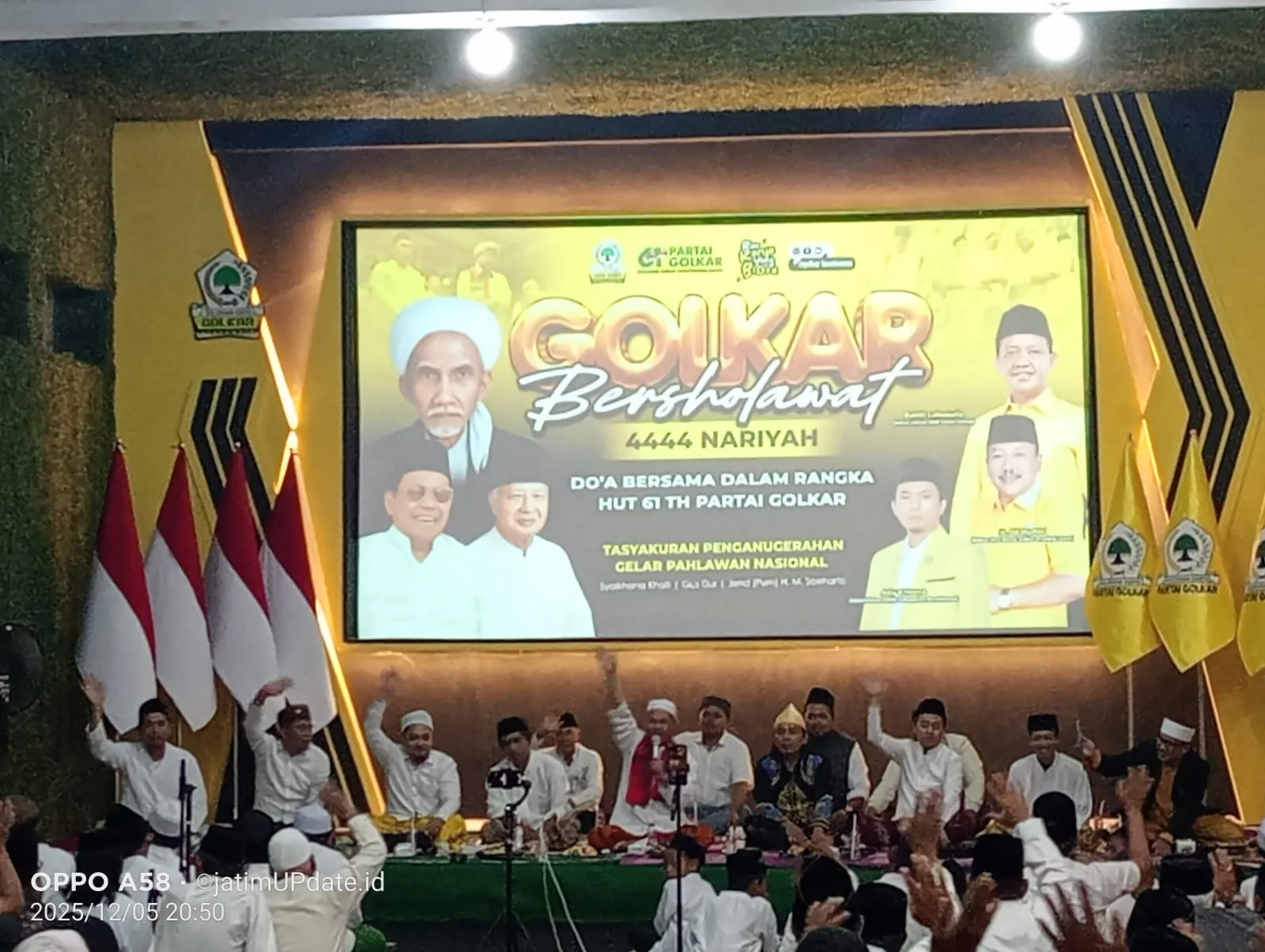 Bondowoso — DPD Partai Golkar Bondowoso menggelar kegiatan “Golkar Bersholawat” dengan pembacaan 4.444 Sholawat Nariyah di Aula DPD Golkar Bondowoso, Jumat malam (5/12/2025).