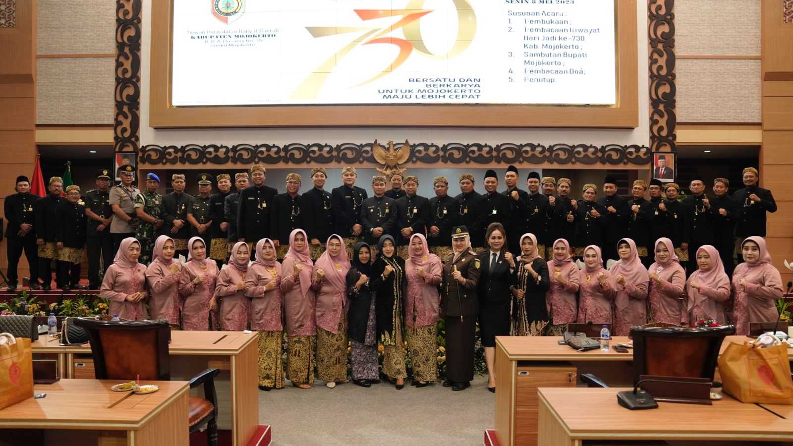 Mojokerto – Wali Kota Mojokerto Ika Puspitasari Menghadiri Sidang Paripurna Dewan Perwakilan Rakyat Daerah (DPRD) Kabupaten Mojokerto dalam rangka memperingati Hari Jadi Kabupaten Mojokerto ke-730, di Ruang Rapat Graha Whicesa DPRD Kabupaten Mojokerto, Senin (8/5/2023).