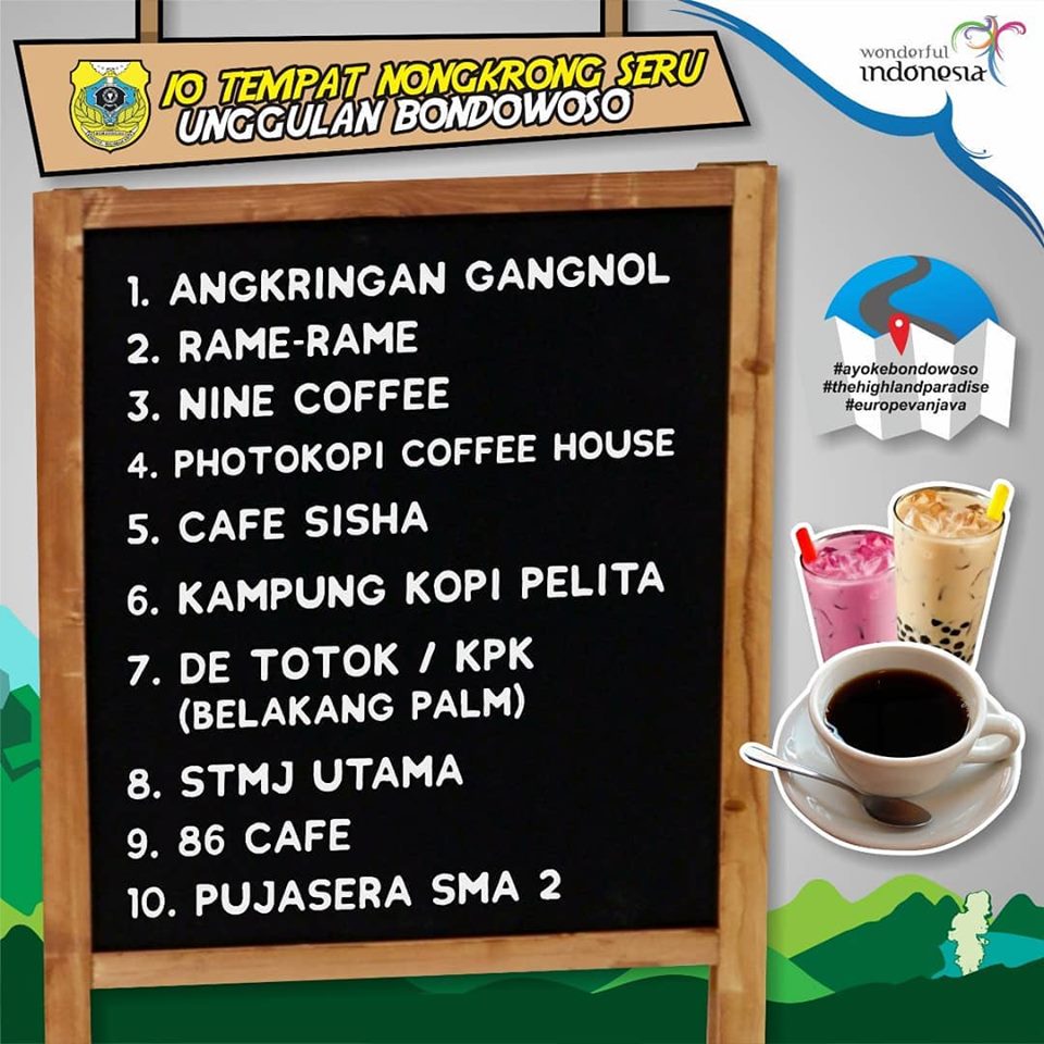 Bondowoso juga dikenal sebagai Republik Kopi, karena citarasa Kopi Jawa-nya yang sudah mendunia. Pengen nikmatin Kopi Jawa asli yang digiling bukan digunting? Dateng aja ke Bondowoso, banyak tempat nongkrong yang menyediakan kopi asli Bondowoso. Berikut referensi 10 tempat nongkrong di Bondowoso yang bikin malam makin seru.