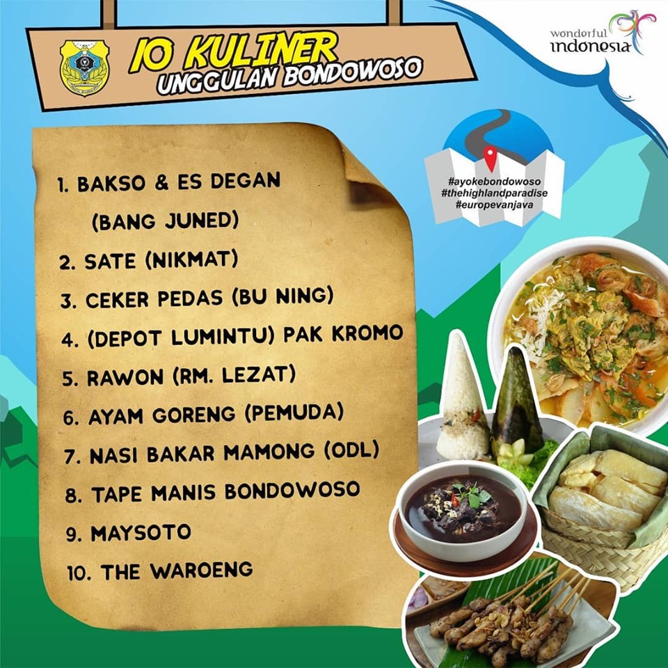 Jangan salah, Bondowoso punya banyak sekali ragam kuliner. Yang pasti sih cuman di Bondowoso bisa dapet tape paling top se-Indonesia, soalnya di sini emang Kota Tape,Menu lain? Banyak pilihannya. Berikut daftar 10 kuliner / tempat kuliner unggulan yang bisa dicobain di Bondowoso.