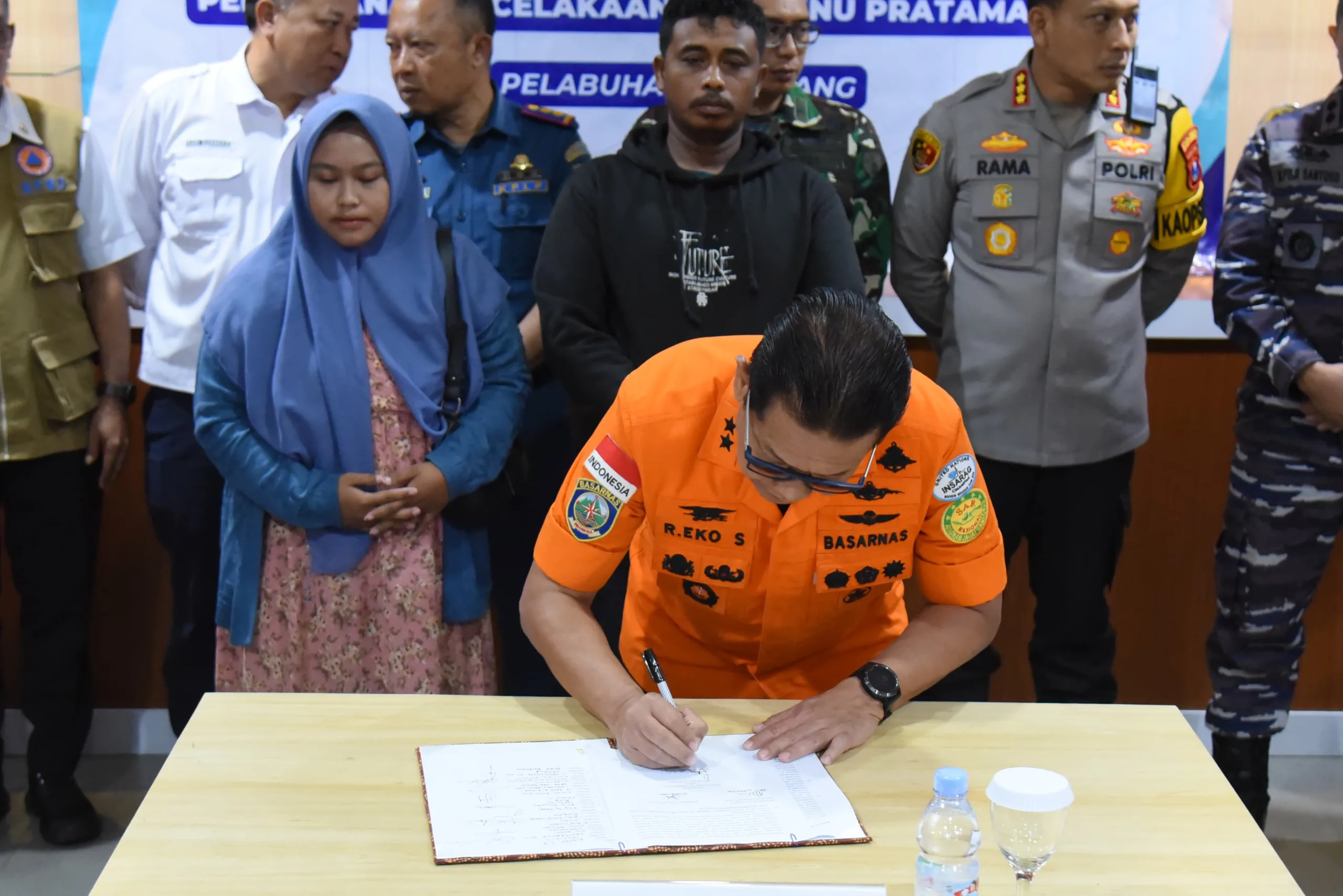 Deputi Operasi dan Kesiapsiagaan Basarnas, Ribut Eko Suyatno bersama keluarga korban tenggelamnya kapal, telah menandatangani berita acara pengalihan operasi SAR, Selasa (15/7/2025).