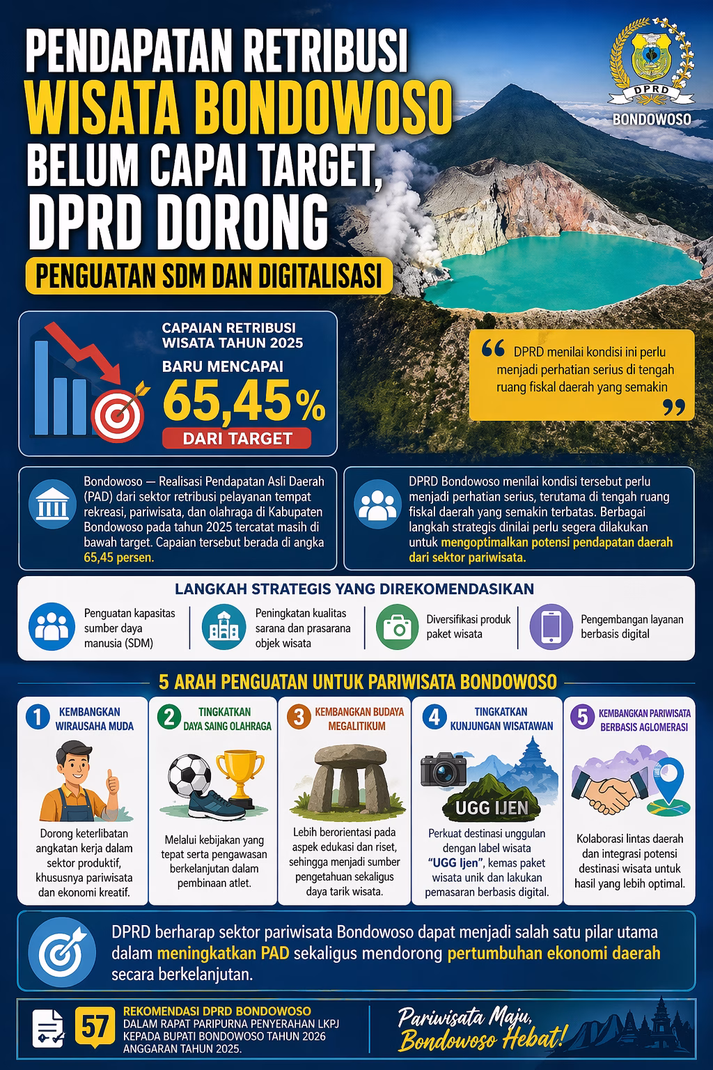 Dewan Perwakilan Rakyat Daerah (DPRD) Bondowoso menilai kondisi tersebut perlu menjadi perhatian serius, terutama di tengah ruang fiskal daerah yang semakin terbatas. Berbagai langkah strategis dinilai perlu segera dilakukan untuk mengoptimalkan potensi pendapatan daerah dari sektor pariwisata.