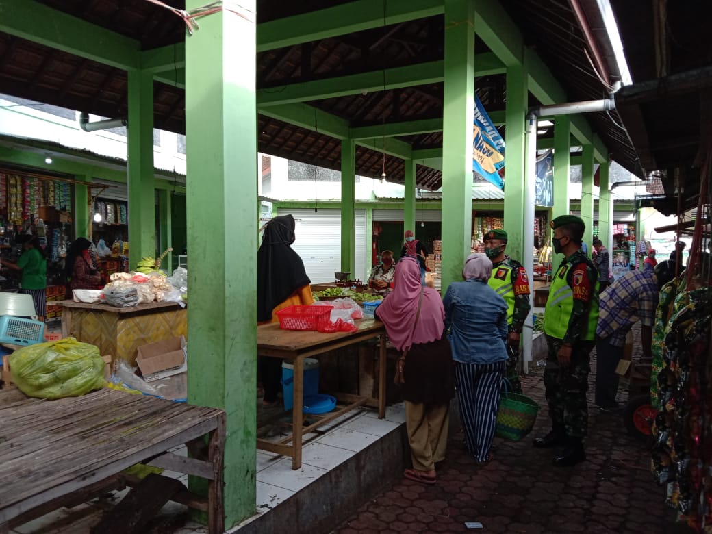 Bondowoso ,Serka Mulyadi dan Serda Faesal Fajar Babinsa Nangkaan melakukkan oprasi Yustisi di Pasar Nangkaan Bondowoso, Selasa 19/01/2021.