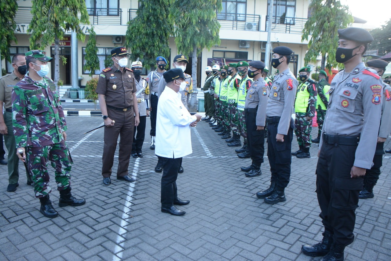 Situbondo – Personel gabungan TNI, Polri dan Instansi Pemerintah mengikuti apel gelar pasukan Operasi Ketupat Semeru 2021 di Polres Situbondo yang dihadiri Forkopimda Situbondo, Selasa (4/5/2021).