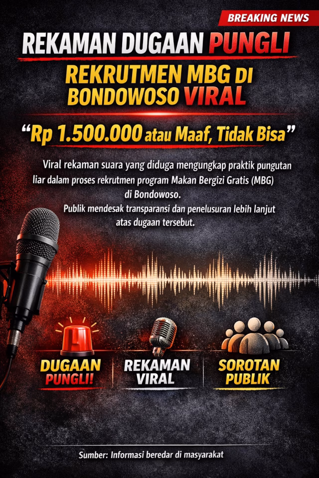 Bondowoso – Dugaan praktik pungutan liar (pungli) dalam proses rekrutmen karyawan program Makan Bergizi Gratis (MBG) mencuat di Kabupaten Bondowoso.