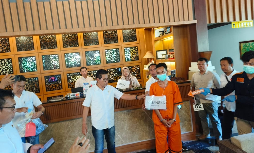 Dari pantauan di lokasi, adegan demi adegan diperagakan oleh tersangka AF. Tampak, petugas menjaga ketat area hotel dengan memasang police line.