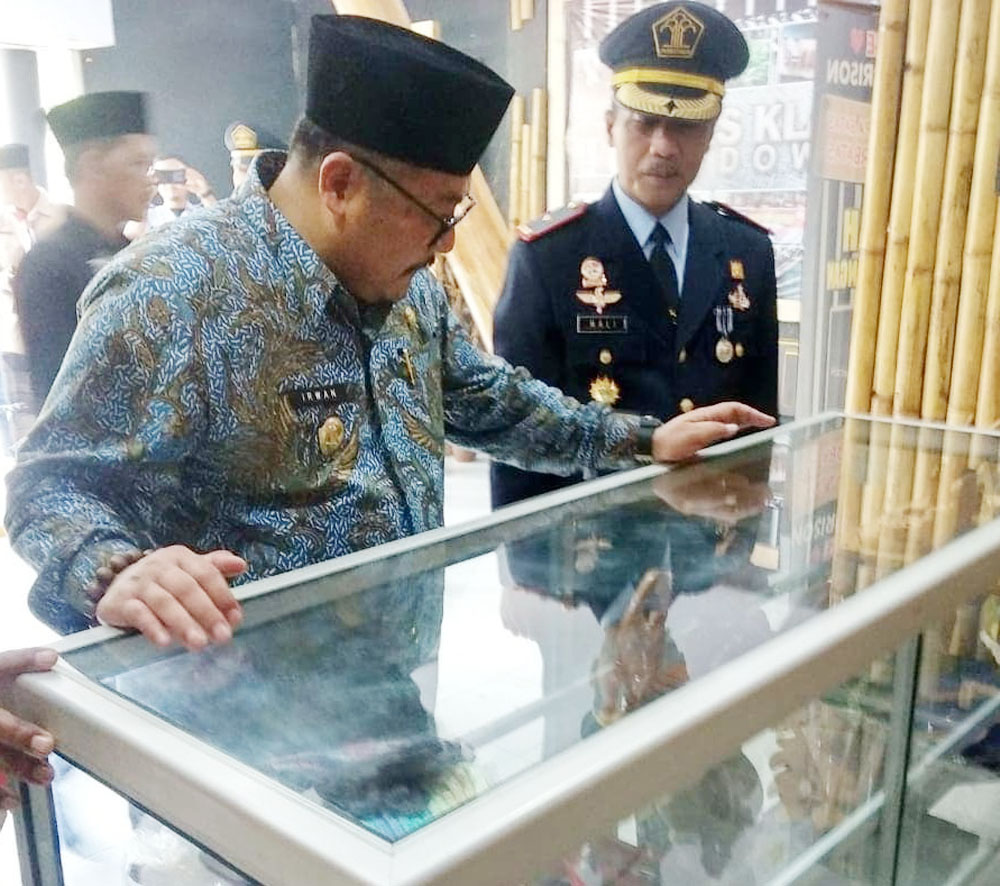 Bondowoso – Wakil Bupati Bondowoso H.Irwan Bachtiar saat meresmikan galeri Bang Napi dan meninjau beberpa karya hasil para warga binaan di depan Lapas Bondowoso,Sabtu (27/4/2019).