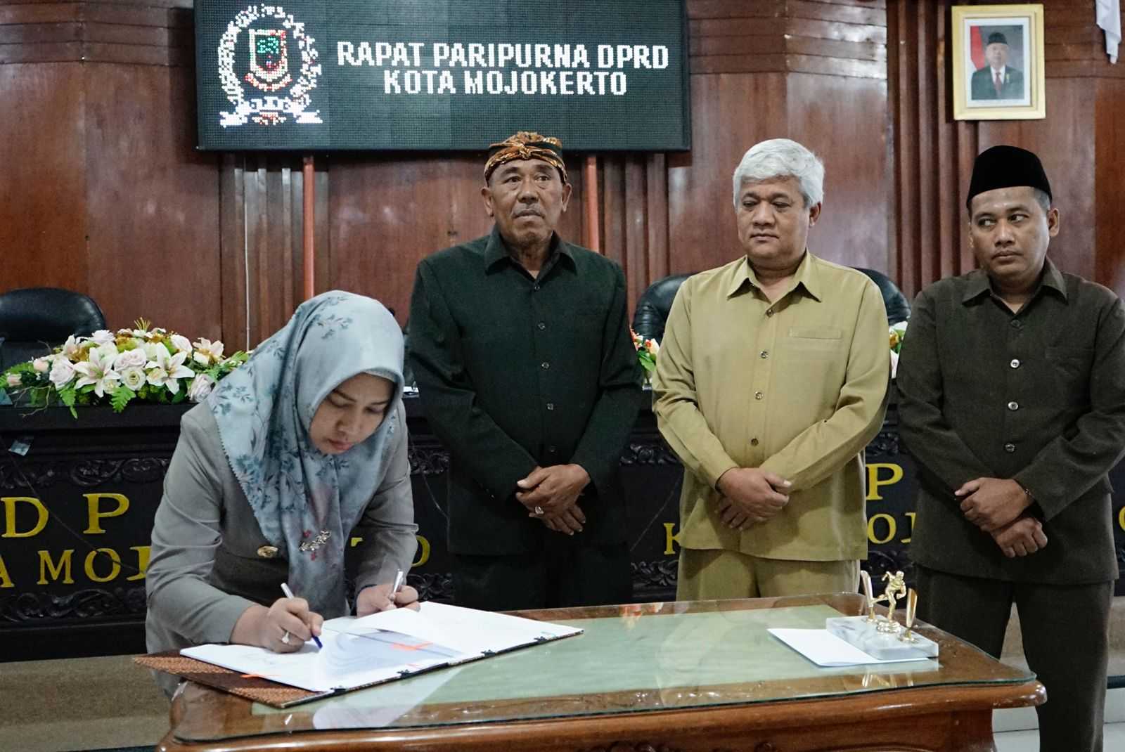 Pasca penetapan persetujuan raperda, dalam forum rapat paripurna tersebut juga dilakukan penandatangan berita acara oleh Wali kota Mojokerto, Ketua dan Wakil Ketua DPRD Kota Mojokerto.