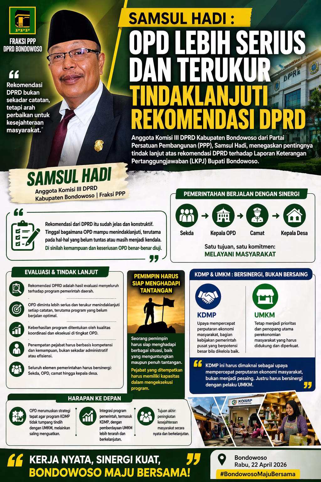 Bondowoso – Anggota Komisi III DPRD Kabupaten Bondowoso dari Partai Persatuan Pembangunan (PPP), Samsul Hadi, menegaskan pentingnya tindak lanjut atas rekomendasi DPRD terhadap Laporan Keterangan Pertanggungjawaban (LKPJ) Bupati Bondowoso. Hal tersebut disampaikannya saat ditemui di ruang kerjanya, Rabu (22/4/2026).