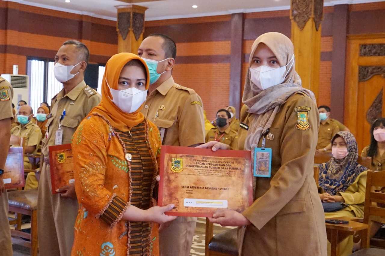 Hal itu disampaikan Ning Ita saat menyerahkan Surat Keputusan (SK) Kenaikan Pangkat (KP) periode 1 Oktober 2022 pada 228 ,di ruang Sabha Mandala Madya, Kantor Pemerintah Kota Mojokerto, Senin (3/10/2022).