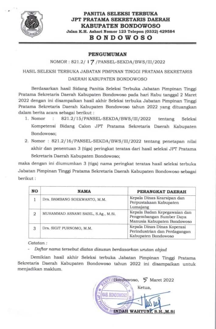 Dikutip dari laman resmi https://bkpsdm.bondowosokab.go.id, telah diunggah surat pengumuman nomor 821.2/17/PANSEL-SEKDA/BWS/2022 hasil seleksi terbuka Jabatan Pimpinan Tinggi Pratama (JPT Pratama) Sekretaris Daerah Kabupaten Bondowoso.