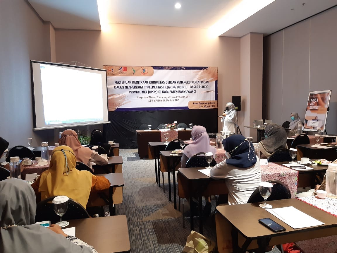 Begitu juga dengan Yayasan Bhanu Yasa Sejahtera (YABHYSA) Kabupaten Banyuwangi, sebagai komunitas yang sangat peduli dan aktif dalam penanggulangan TBC, YABHYSA turut pula mendukung strategi PPM yang dilaksanakan di tingkat kabupaten atau yang biasa disebut dengan Distric-Based Public-Private Mix (DPPM). Aksi nyatanya diwujudkan dalam bentuk pertemuan dengan pemangku kepentingan yang diadakan selama 2 hari di Hotel Aston Banyuwangi. Pertemuan yang diadakan pada tanggal 29 dan 30 Juni 2022 ini bertujuan untuk membangun pemahaman dan komitmen bersama pemangku kepentingan terkait alur dan rencana kerja operasional pelibatan komunitas dalam jejaring DPPM.
